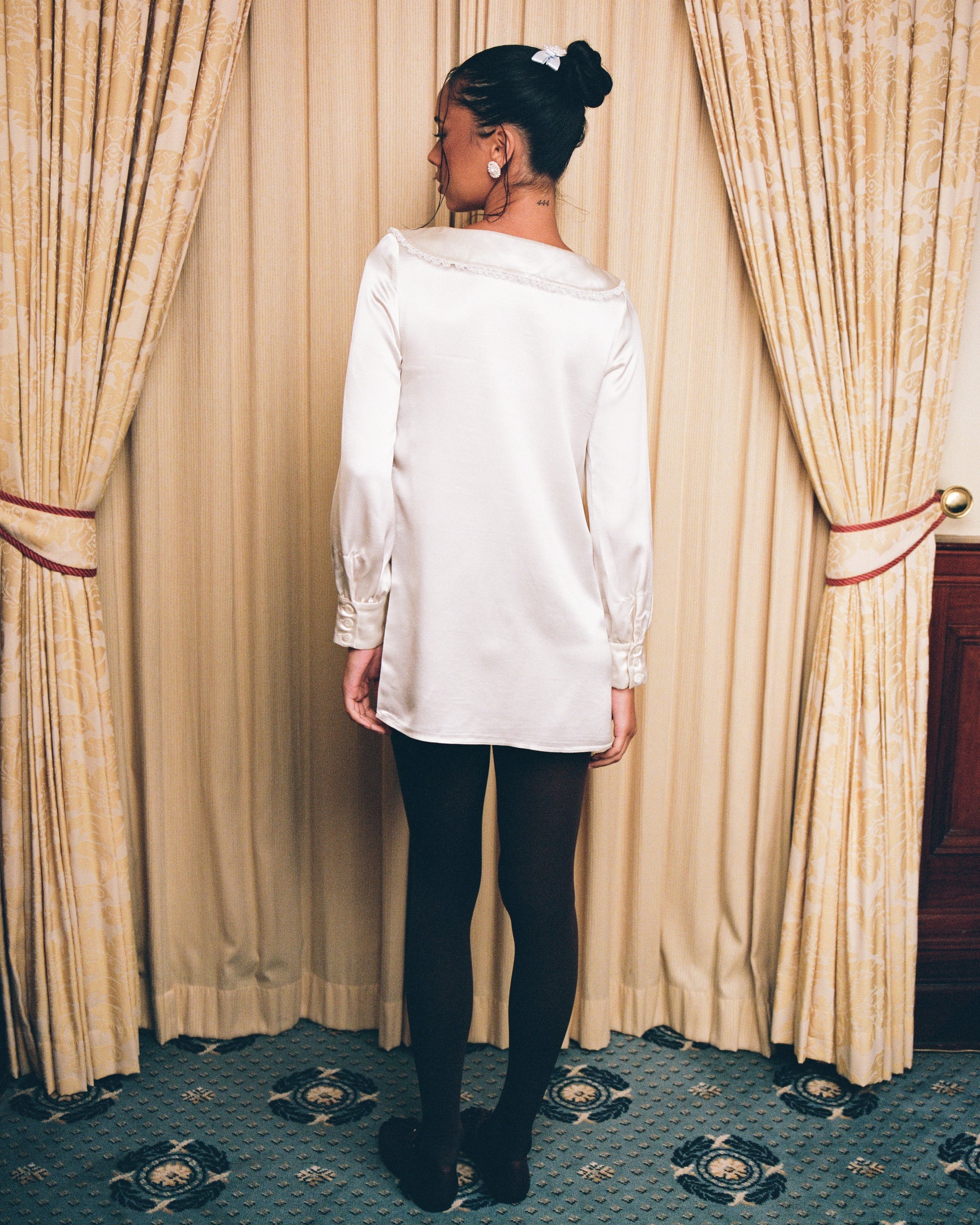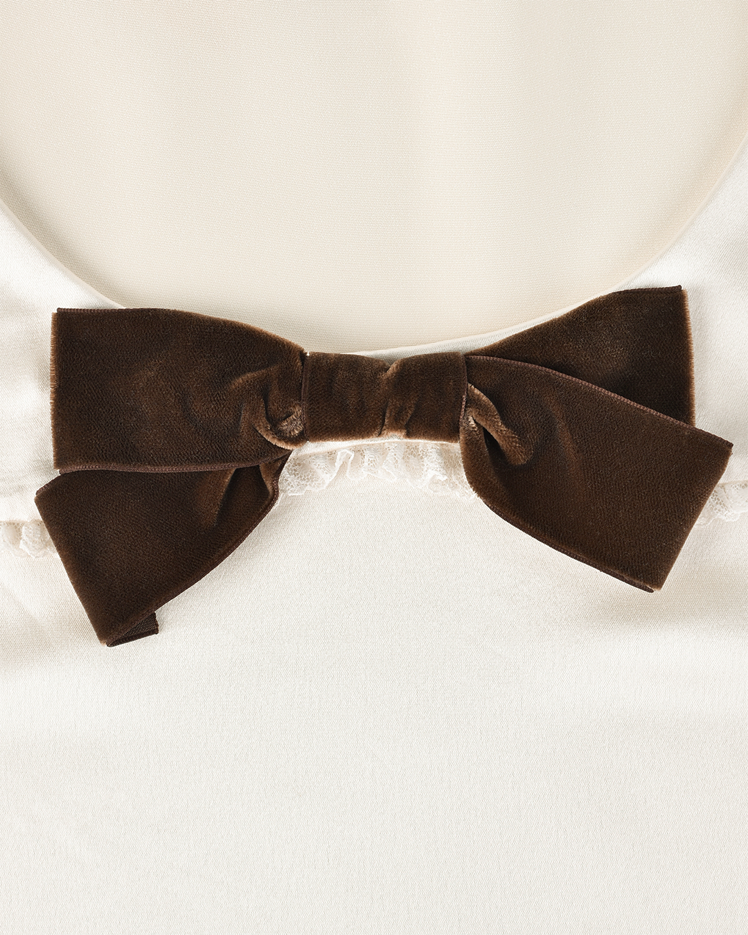 Long sleeves with button cuffs, lace-trimmed Peter Pan collar, and a contrast velvet bow at the neckline.