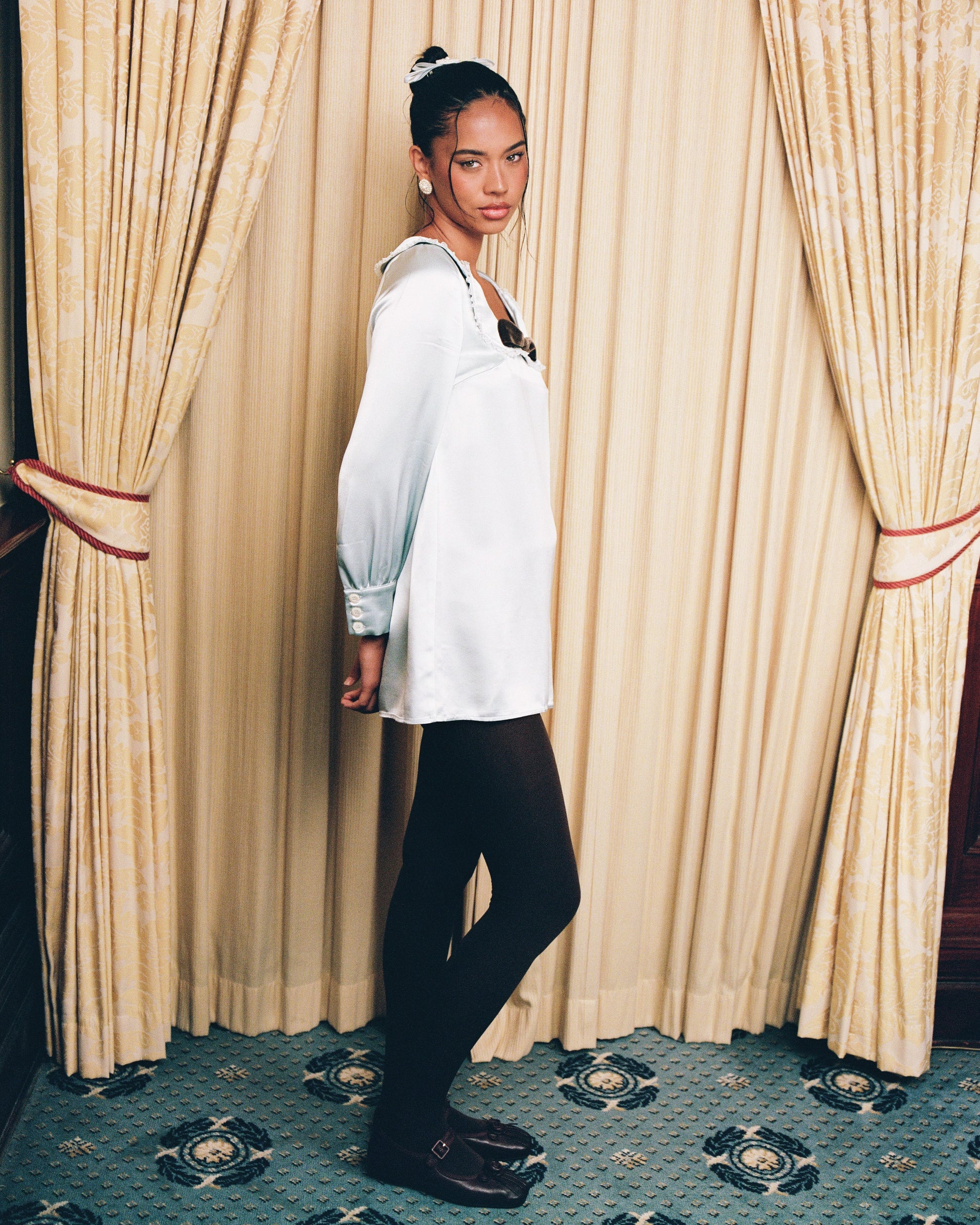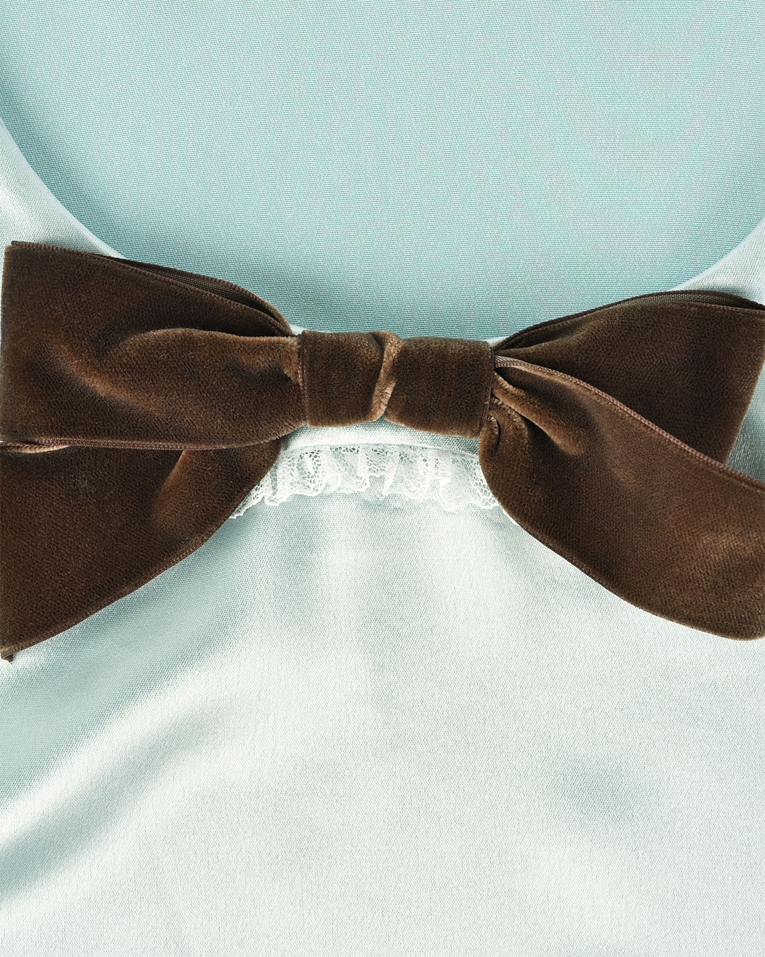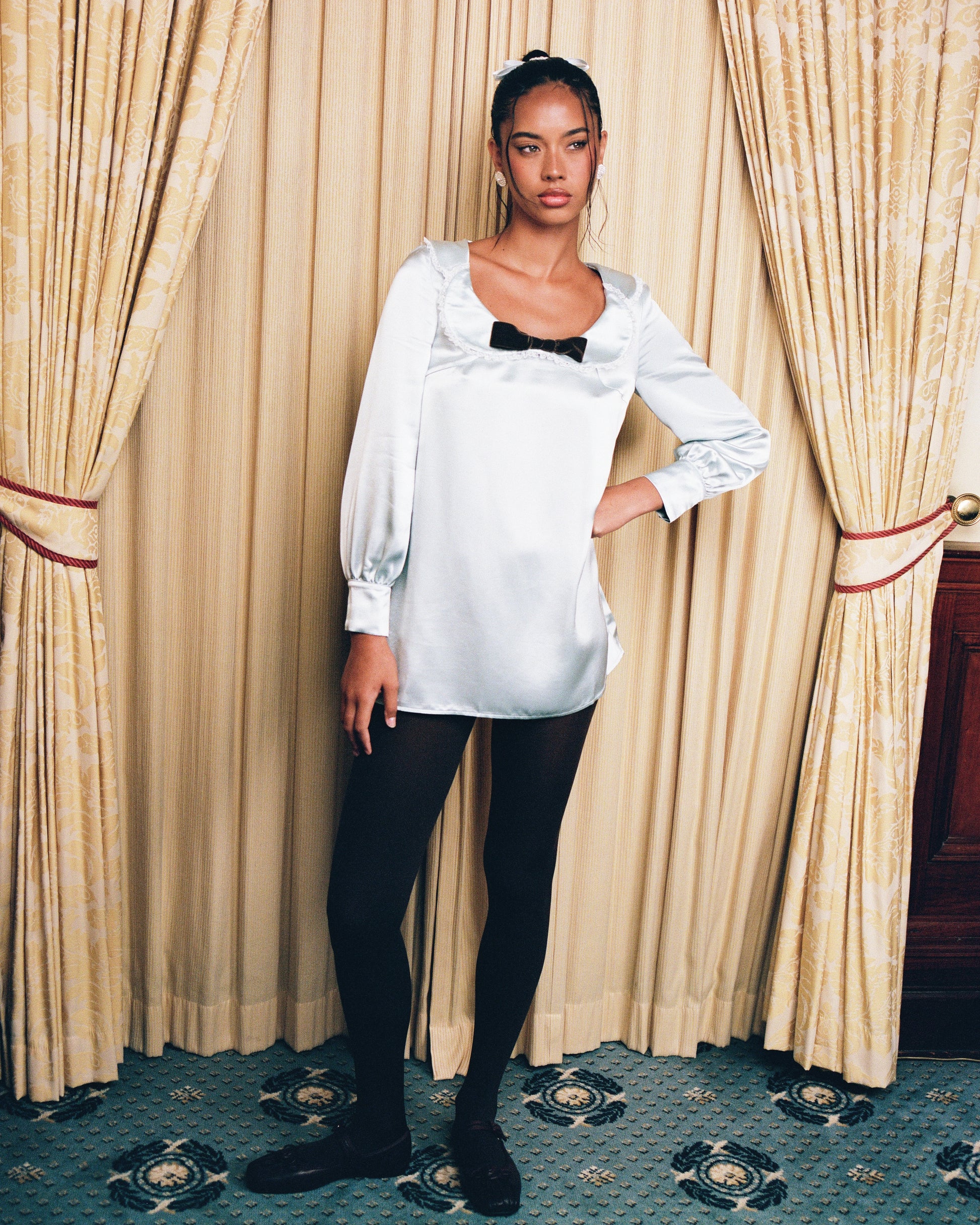 Vintage-inspired relaxed mini dress with a subtle sheen on soft acetate fabric. Long sleeves with button cuffs, lace-trimmed Peter Pan collar, and a contrast velvet bow at the neckline.
