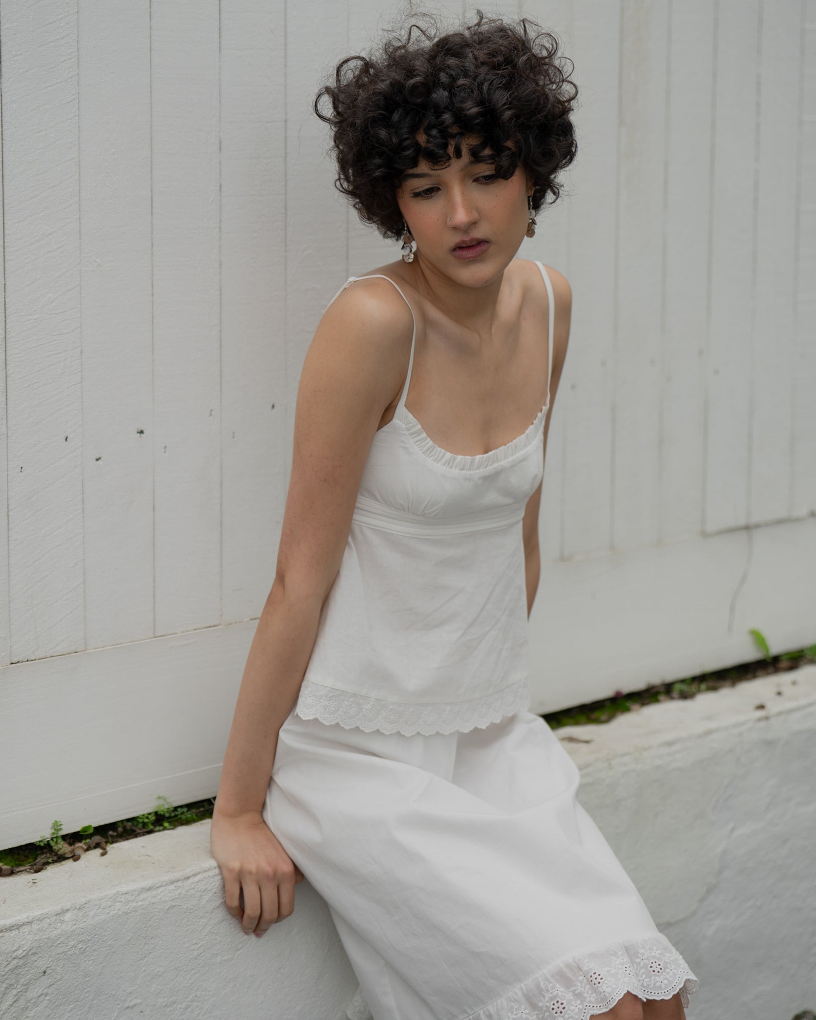 Organic cotton camisole with gather detail along edge, pleat detail at underbust and broderie anglaise trim at hem. Zipper closure at side.
