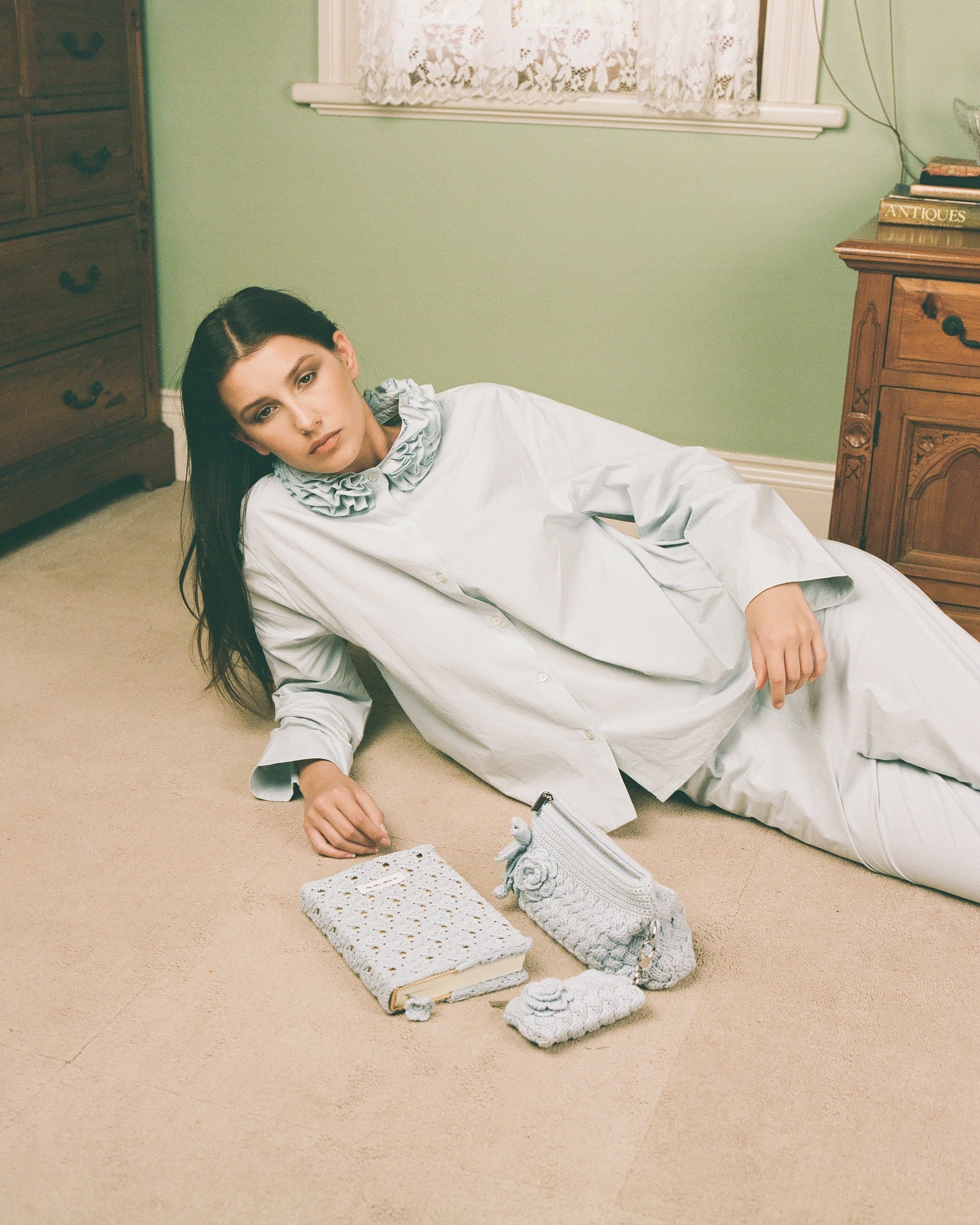 Delicate double ruffle neckline frames the face, with natural shell buttons down the front.