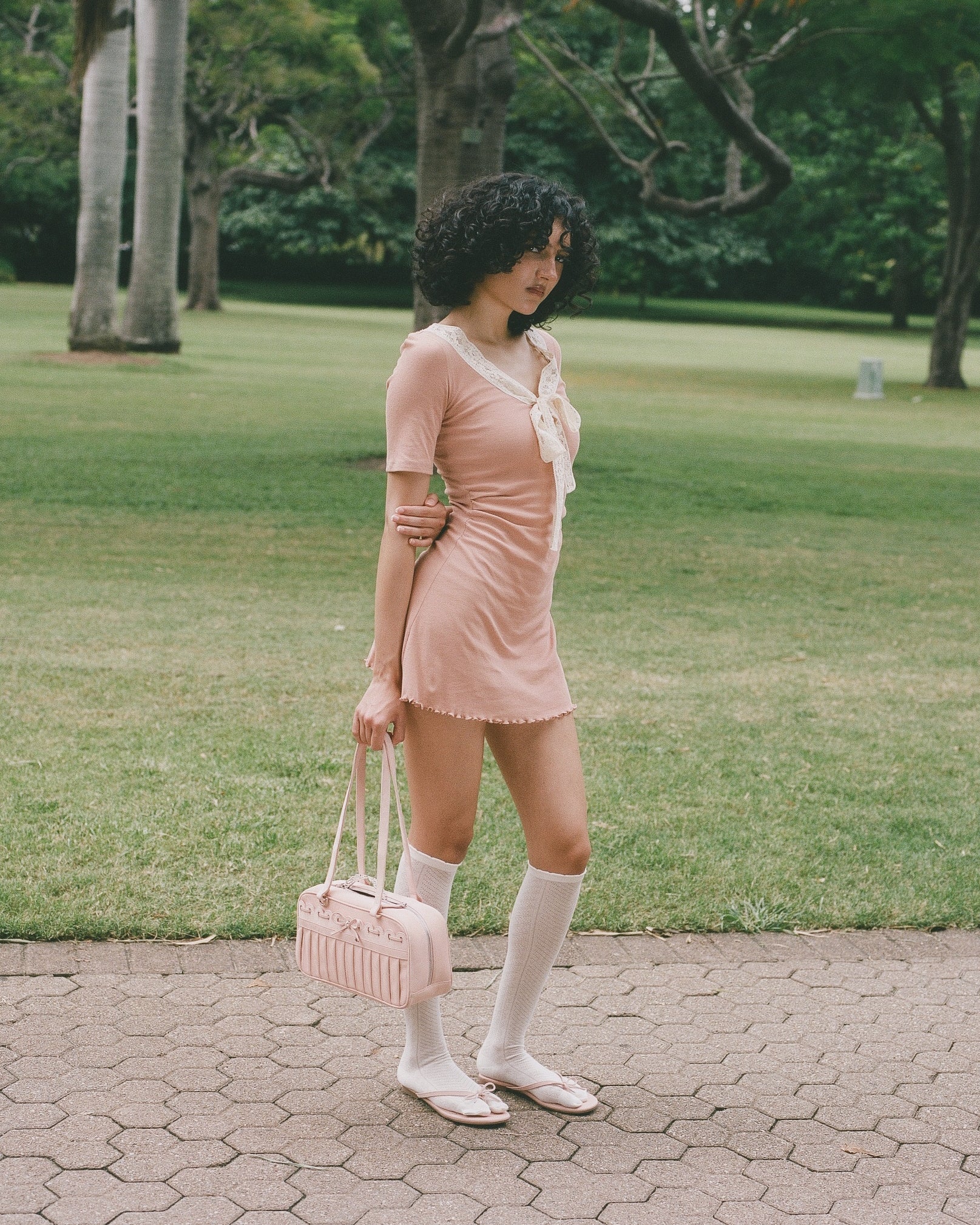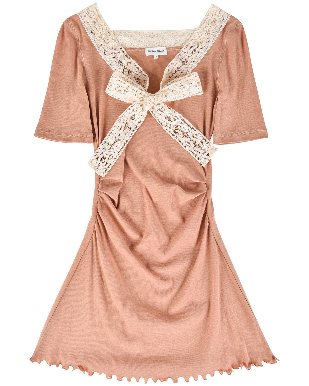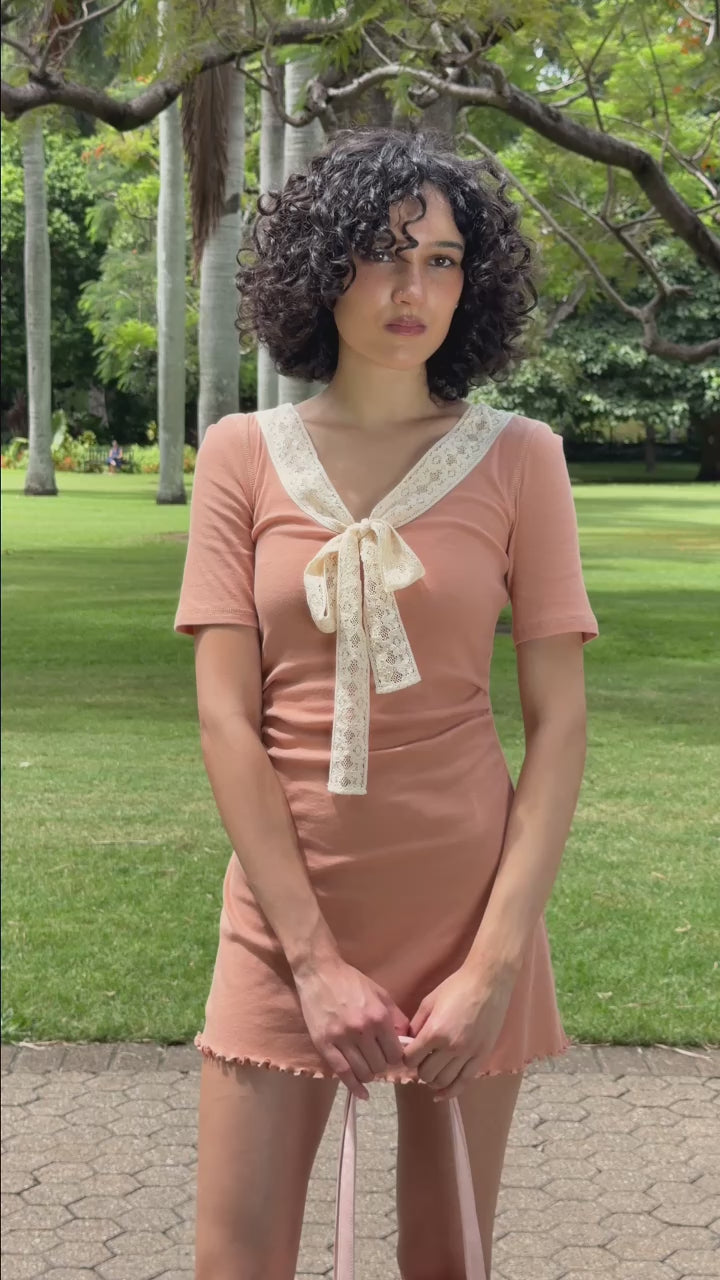 Mini dress featuring a deep V-neckline trimmed with lace, a long lace tie at the front, short fitted sleeves, a body-skimming silhouette, and a lettuce-edge hem.