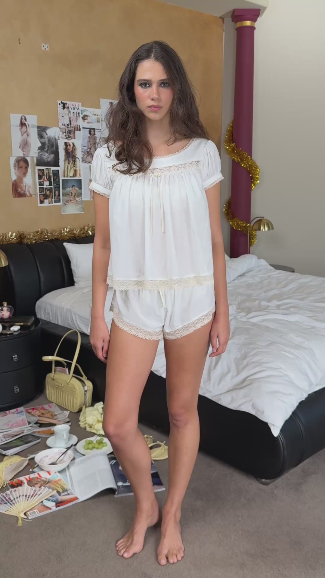 Gathered blouse with lace trim. Features a wide neckline with lace edging, short puff sleeves with lace cuffs, and a gathered bodice. Finished with a straight silhouette and lace trim at the hem.