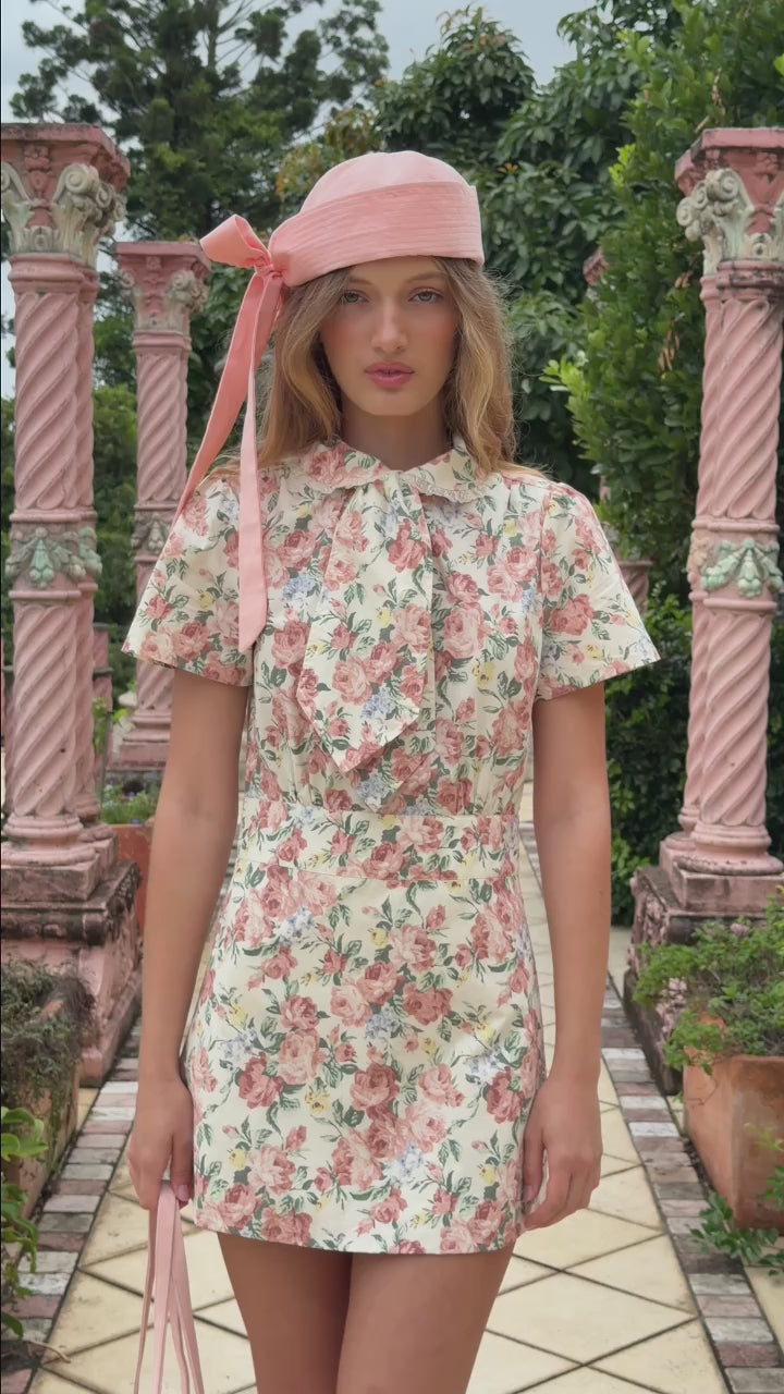 Floral mini dress featuring a rounded collar with an attached self-tie bow, softly gathered bust detailing, flutter short sleeves, a shaped waistband for definition, and a straight mini skirt with a clean finish. Zipper closure at back.