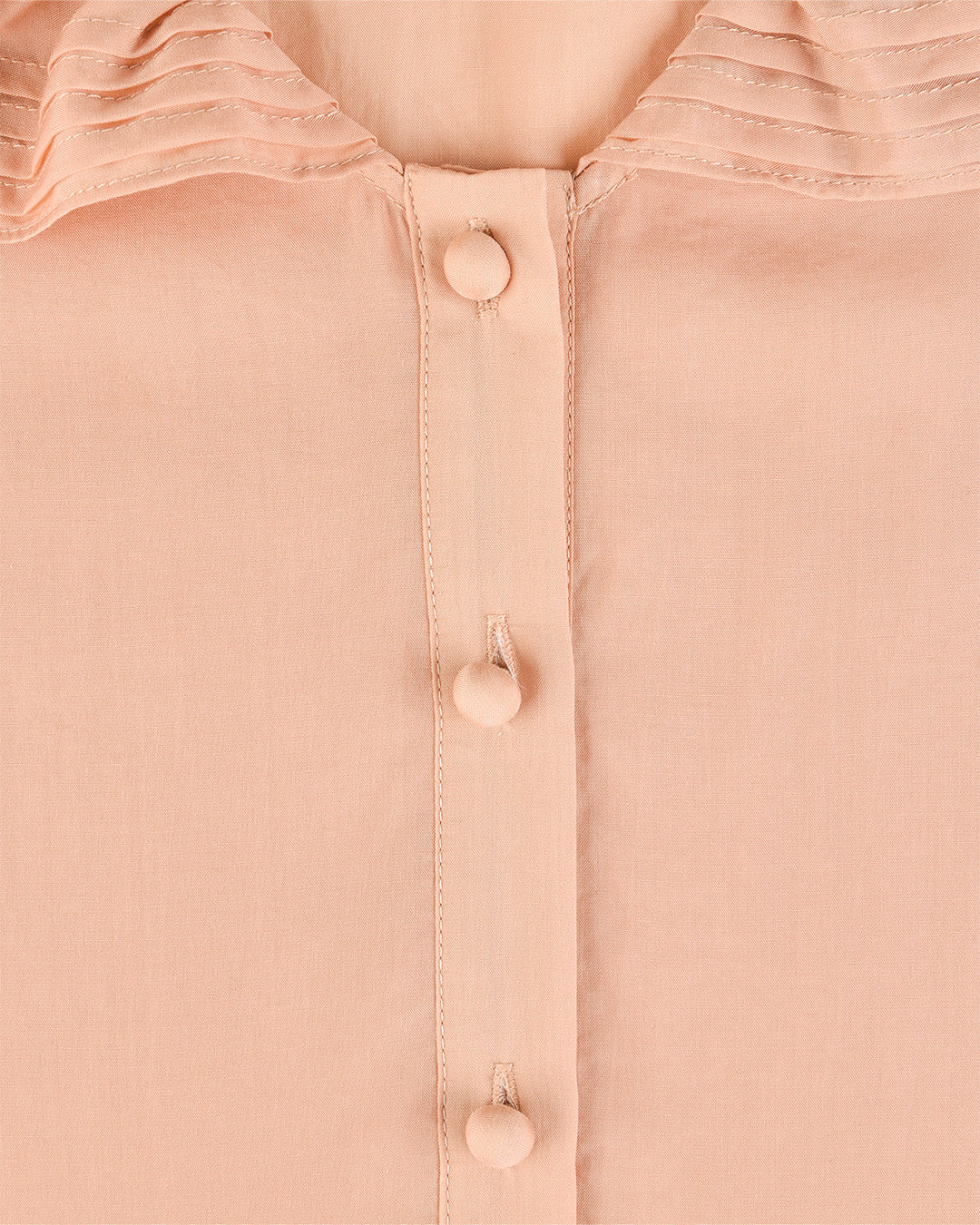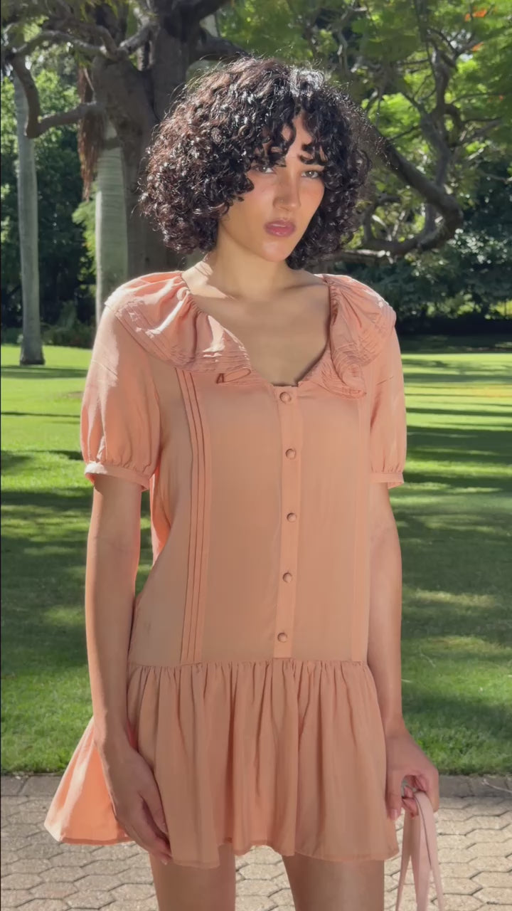Button-front mini dress featuring short puff sleeves with gathered cuffs, and a tiered collar with folded panel detailing. Designed with a lightly gathered drop waist and a flared skirt.