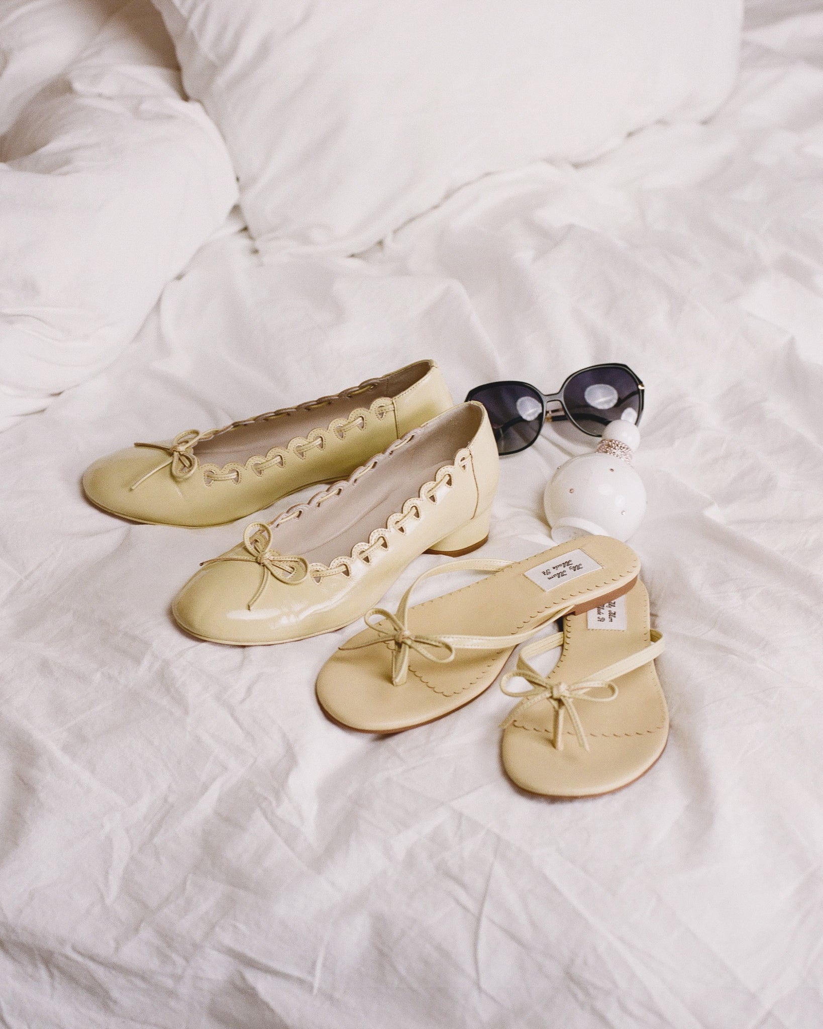 Round-toe ballet pumps with scalloped edging, threaded strap detailing along the opening, and a front bow. Finished with a short heel and stitching detail.