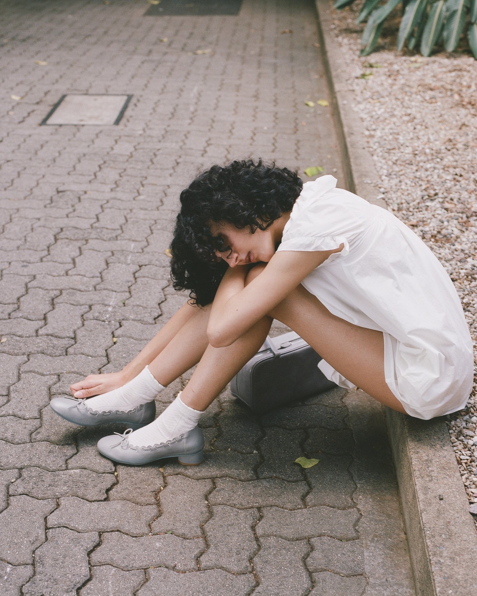 Round-toe ballet pumps with scalloped edging, threaded strap detailing along the opening, and a front bow. Finished with a short heel and stitching detail.