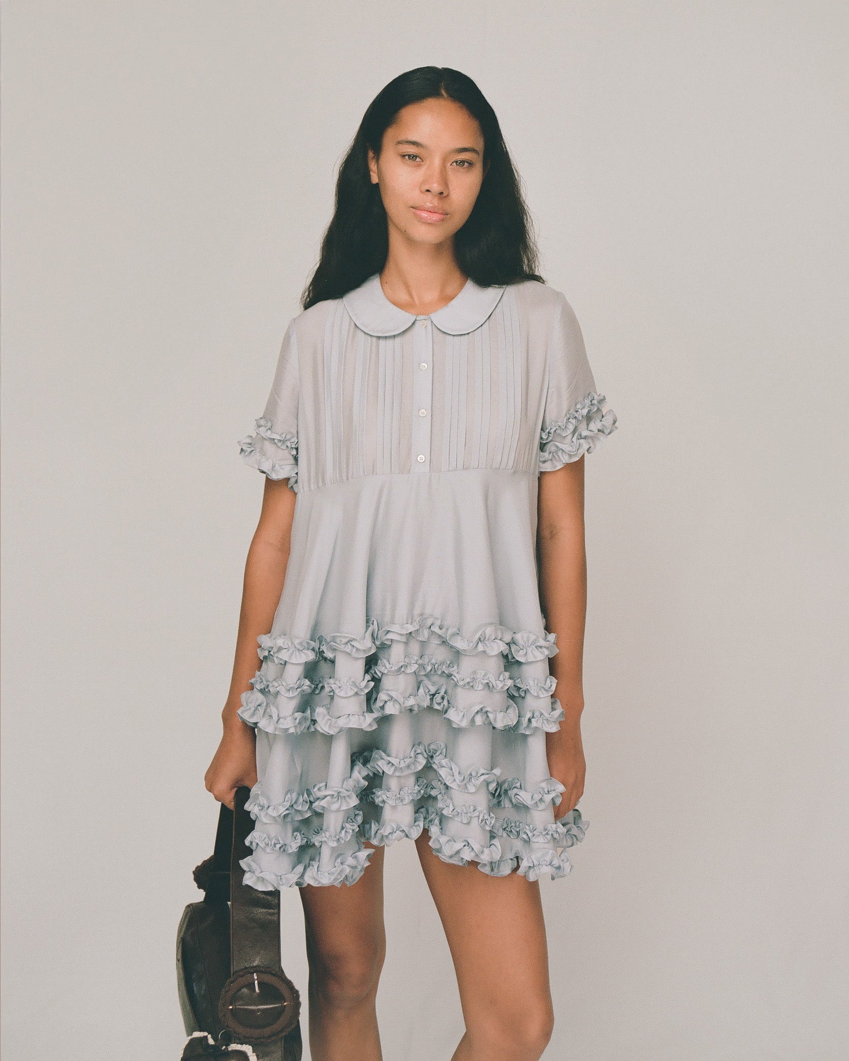 Romantic mini dress with vertical pintucks on the bodice and a rounded Peter Pan collar.