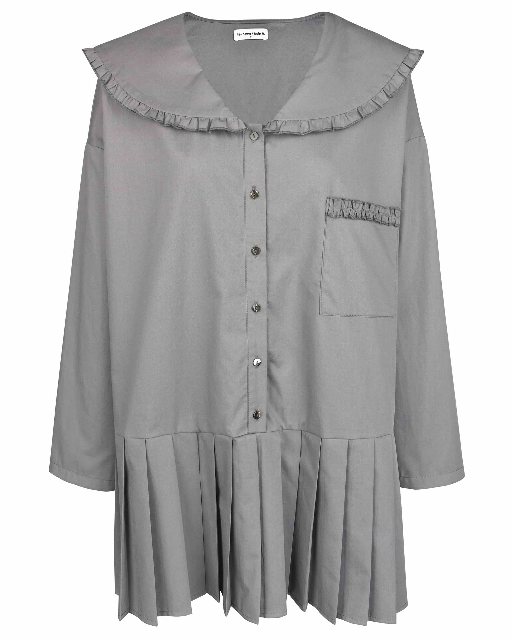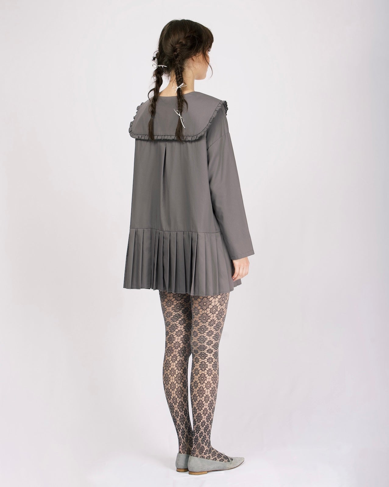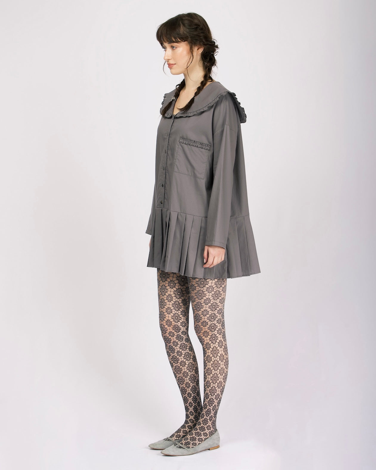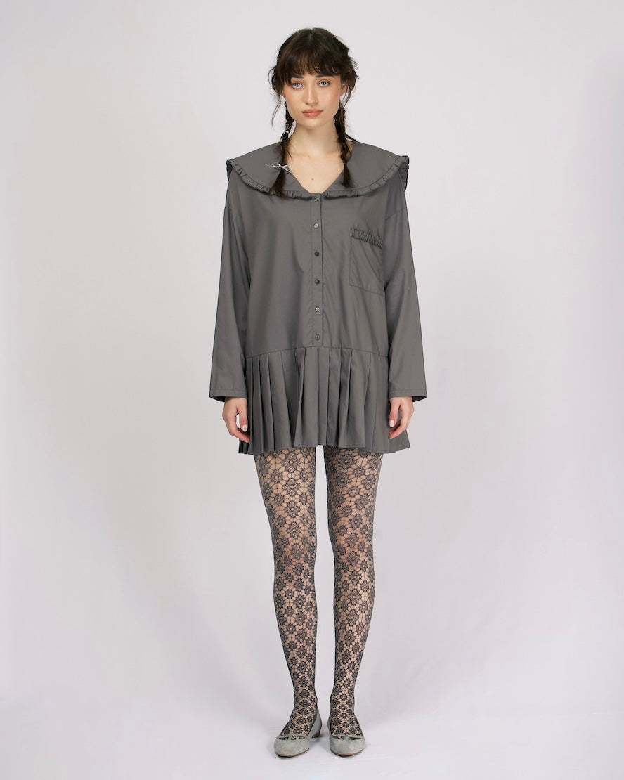 Fitted textured mini dress with layer skirt. Zipper closure at side and button detail at back. Frill edge detail at sleeves and collar.