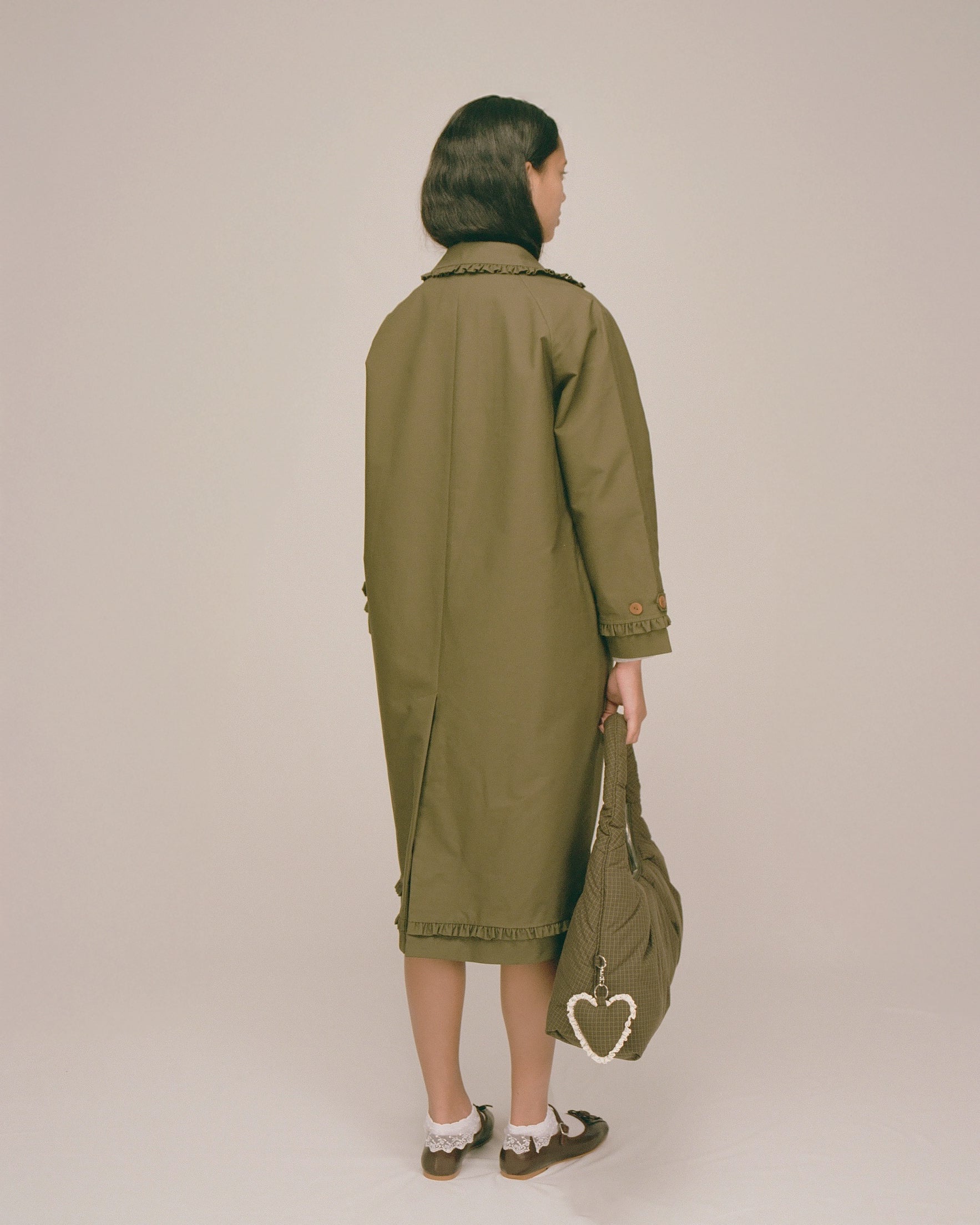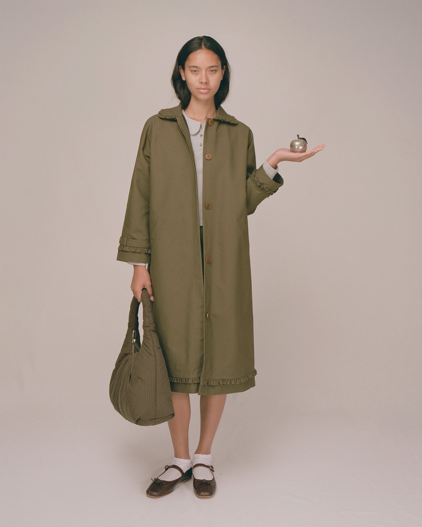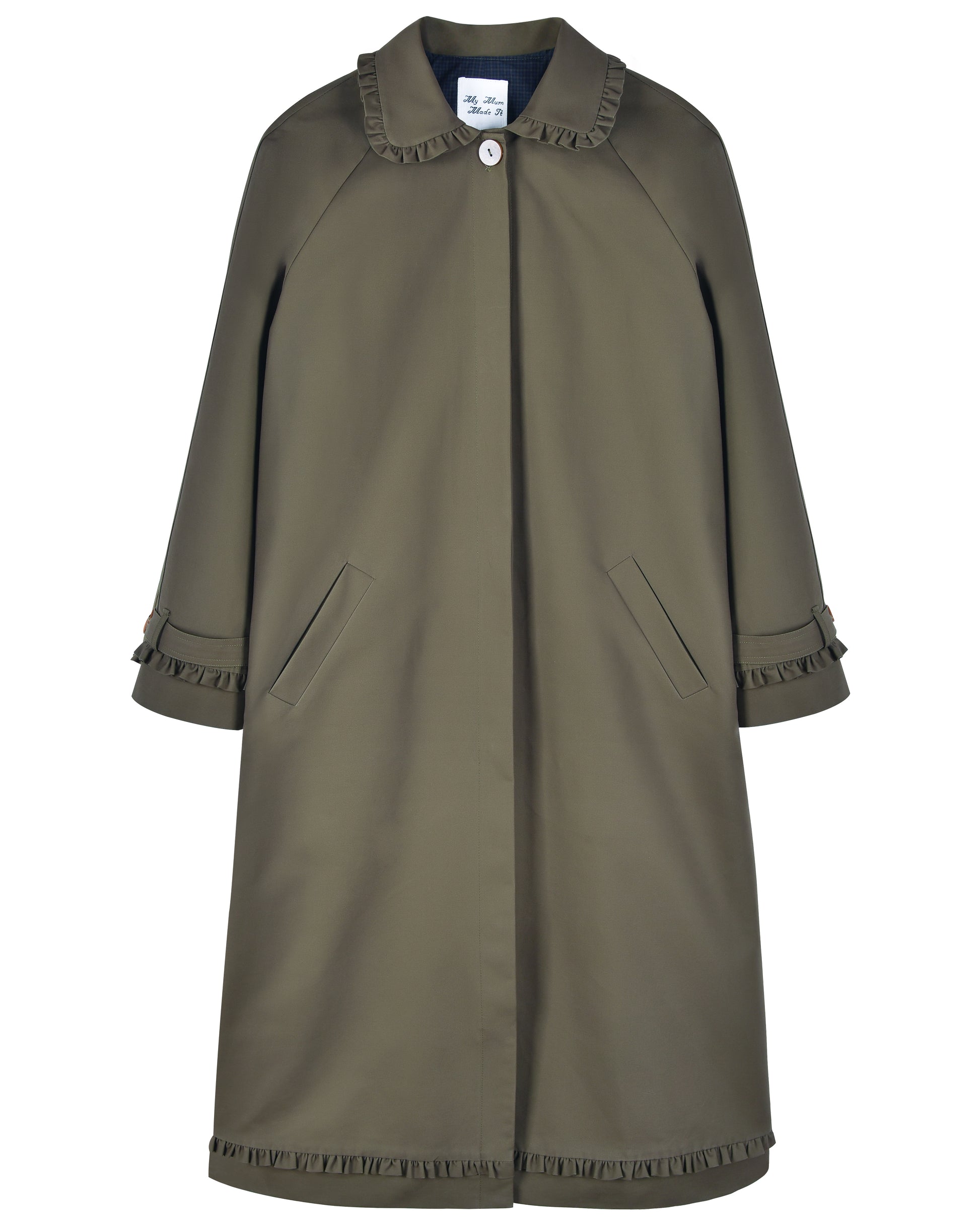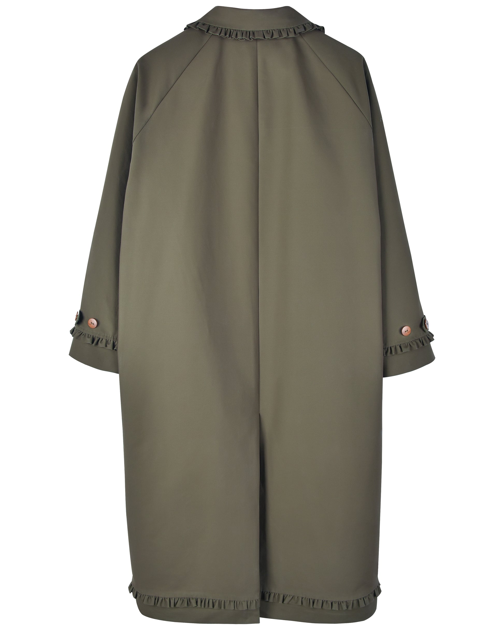 Subtle ruffle trim at collar, cuffs, and hem adds a soft, feminine touch.